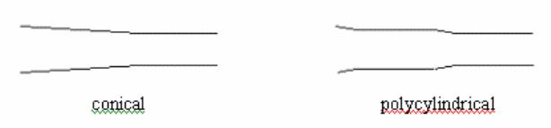 2. The barrel bore affects the tuning of the upper part of the second register and the lower altissimo notes; these are sharpened if the barrel bore is enlarged. It also exerts a disproportionally large effect on the playing feel and resistance of the entire range of the instrument. Current French style clarinets most often have a reverse conical shape (tapering towards the bottom) in the barrel bore. 3. The top part of the upper joint, most importantly in the region of the speaker hole, is enlarged to bring the middle twelfths into tune. This expansion is generally either conical - tapering towards the bottom, over either the top part of the joint or in some cases the entire joint - or "polycylindrical", i.e., with a cylindrical upper section larger than the main bore: 4. The lower joint has a long, gradually flaring expansion from around the Ab/Eb tone hole down to the bottom. This functions to narrow somewhat the wide twelfths at the bottom of the scale caused by the oversized and misplaced speaker tube; as we know, however, this is not completely effective (bottom F in particular is usually still uncomfortably flat on most clarinets). A point worth emphasising is that it is the difference in bore size between the central section and the speaker hole region that controls the tuning of the middle twelfths; it is not, as is often erroneously stated, the size of the bore by itself. Much misunderstanding is caused by comparing the intonation of large bore clarinets with no upper joint expansion (for example, the Boosey & Hawkes 1010) with that of small bore instruments with a large amount of upper joint expansion (most recent French style clarinets); it is really the shape, not the size, of the bore that is being compared. In the main, the evolution