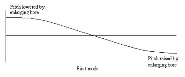 Bore perturbations and tuning the registers If a woodwind has a bore that is basically cylindrical or conical, but the bore is slightly enlarged or reduced over part of its length (this is called a bore perturbation), the resonance frequencies are modified according to the following principle: A localised enlargement of the bore lowers the frequency of vibration of modes which have high pressure in the region of enlargement, and raises the frequency of modes having low pressure in that region. A contraction of the bore has the opposite result. In a clarinet, the lowest mode of vibration has high pressure towards the reed (closed) end, and low pressure towards the bell (open) end of the air column; so enlarging the bore in upper part will lower the pitch of the fundamental mode, while enlarging the bore in the lower part will raise it. The second mode (on which the second register is based) has a pressure node one third of the way down the air column, giving two regions where enlarging the bore will lower the pitch and two regions where it will raise the pitch: