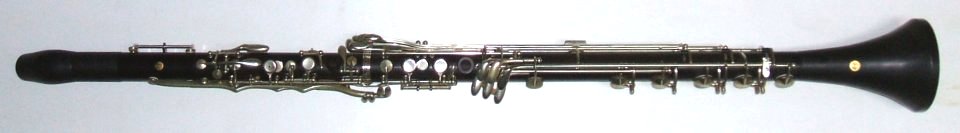 This is perhaps the ideal compromise between the small and medium bore basset horn concepts. With the barrel adaptors supplied, it can be played either with a conventional Bb/A clarinet mouthpiece, giving the veiled sound and high resistance characteristic of the small bore model, or with a German basset horn mouthpiece, giving the power and projection appropriate for use in a large modern ensemble. The bore diameter of 16.0mm classifies it generically as small bore, but it has been designated as "medium small bore" in order to distinguish it from the S. Fox small bore model, which has ring keys and an even smaller bore. (For further explanation of basset horn bore sizes, please see the main basset horn page on this site.) Unique features include a downward-pointing clarinet-style bell (for stronger bottom notes), and a curved, solid-body barrel (instead of a metal neck). Keywork includes plateau keys except for two open finger holes (L3 and R3). An automatic register/throat Bb mechanism is included, for accurate twelfths and a clear Bb, and a vent attached to the R1 ring improves the tone and tuning of low B natural. An articulated C#/G# key is optional. The standard basset key arrangement has low Eb played by the right hand little finger and three right thumb keys giving D, C#, and C - with the touchpieces shaped to allow smooth transitions between notes - plus an alternate low D key for the left hand little finger. An alternate left hand Ab/Eb lever is also standard. An option is a right hand little finger key (on the upper rank, beside F/C) which is convertible to produce either D or C#. (For thoughts on the basset key arrangement, please see the article on the subject on this website.) A choice of support mechanisms